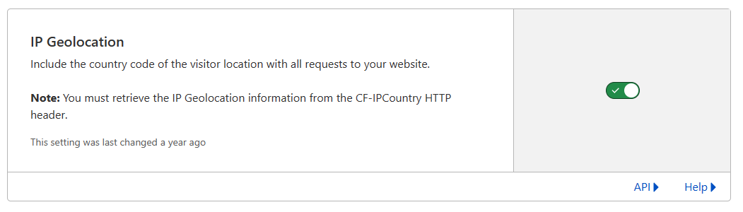 Puede activar la geolocalización de IP para que Cloudflare geolocalice los visitantes en su sitio web y le transmita el código de país en formato Alfa 2 de la norma ISO 3166-1.